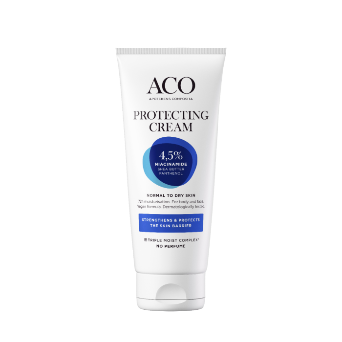ACO Protecting Cream er en ekstra rik krem som tilfører fuktighet intensivt i 72 timer. Utviklet med 4,5 % niacinamid, 6 % sheasmør og 4 % pantenol for å berolige normal til tørr hud, også sensitiv hud. Kremen styrker og beskytter hudbarrieren. ACO’s Triple Moist Complex bidrar til umiddelbar, intensiv og langvarig fuktighet. Lett å påføre, trekker raskt inn i huden og etterlater huden myk og smidig. Uten parfyme. Dermatologisk testet. Vegansk formulering.