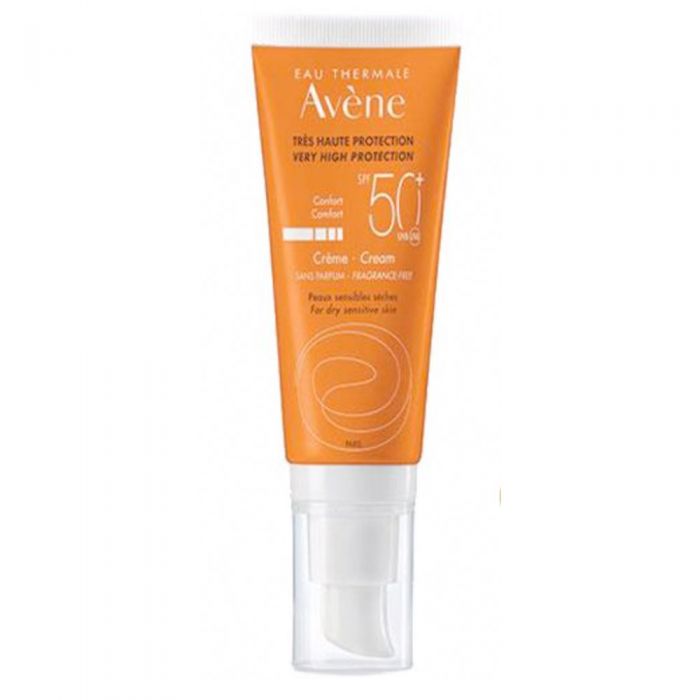 Avène Sun Face Cream SPF50+ 50 ml er en vannresistent ansiktssolkrem til beskyttelse av særlig sensitiv hud, spesielt hos blonde og rødhårede personer med lys hud, samt hud som utsettes for sterk sol. Ansiktssolkremen nedsetter risiko for soleksem og lysfølsomhet. Inneholder høyt innhold av Termalkildevann, som virker beroligende og irritasjonsdempende. Inneholder kun 4 solfiltere. Svir ikke i øynene og gir ikke et hvit skjær på huden. Inneholder antioxidanten pre-tocopheryl, som beskytter huden mot frie radikaler. Fotostabil.