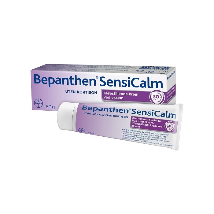 Bepanthen SensiCalm er en kortisonfri krem som raskt både lindrer kløe og stimulerer gjenoppbyggingen av hudbarrieren. Kremen inneholder naturlig pleiende lipider i kombinasjon med dekspantenol, som fremmer hudens naturlige gjenoppbygging av hudbarrieren. Bepanthen SensiCalm krem er beregnet til bruk på uskadet hud hos spedbarn, barn og voksne for å lindre kløe og rødhet forårsaket av hudirritasjoner ved atopisk dermatitt, eksem, allergiske hudreaksjoner og tørr hud. Uten parfyme. Klassifisert som medisinsk utstyr.