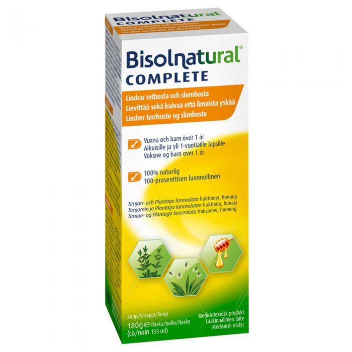 Bisolnatural® Complete er medisinsk utstyr indisert for behandling av hoste, både tørrhoste og slimhoste, og spesielt hoste som skyldes infeksjoner i de øvre luftveiene. Bisolnatural® Complete er 100% naturlig. Hostesirupen inneholder et aktivt kompleks bestående av en polysakkaridfraksjon fra Plantago lanceolata og flavonoidfraksjon fra timian, samt honning, og virker på de irriterte slimhinnene på to ulike måter.