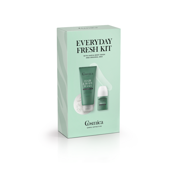 COSMICA EVERYDAY FRESH KIT GAVEPAKKE MED HAIR & BODY WASH OG ORIGINAL DEO. COSMICA for Men Hair & Body Wash er forfriskende rengjøring som gjør hud og hår mykt og gir en lett og frisk duft. Parfymert. COSMICA for Men Original Deo er en mild og effektiv antiperspirant. Motvirker svette og lukt i 48 timer og er samtidig mild og skånsom mot huden. Parfymert.