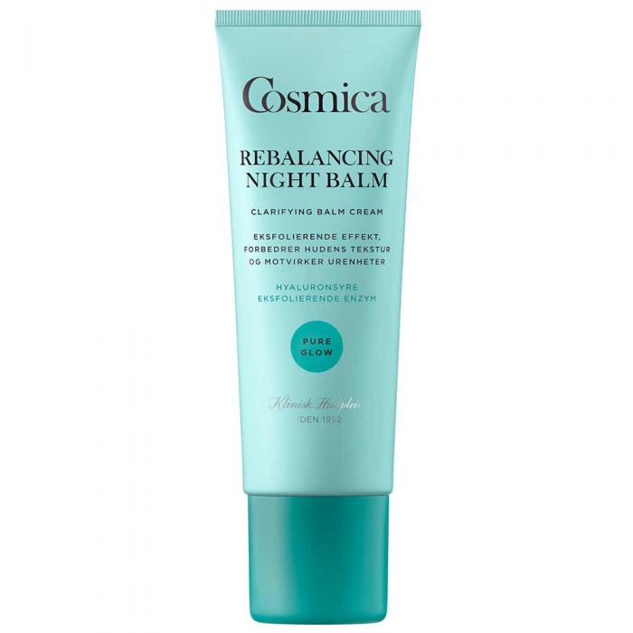 Cosmica Pure Glow Rebalancing Night Balm. En pleiende nattkrem, spesielt tilpasset for voksen hud. Motvirker urenheter og de første aldringstegnene, samt har en balanserende effekt. Gir en smidig og ren hud med synlig reduserte linjer og en naturlig glød. Intensiv fuktighetsgivende i opptil 24 timer. Tetter ikke porene. Inneholder blant annet eksfolierende enzymer som fjerner døde hudceller og gir naturlig glød, hyaluronsyre som binder fuktighet og forbedrer hudens elastisitet og sarcosin som reduserer fet hud og gjør huden matt. Mildt parfymert. Dermatologisk testet.