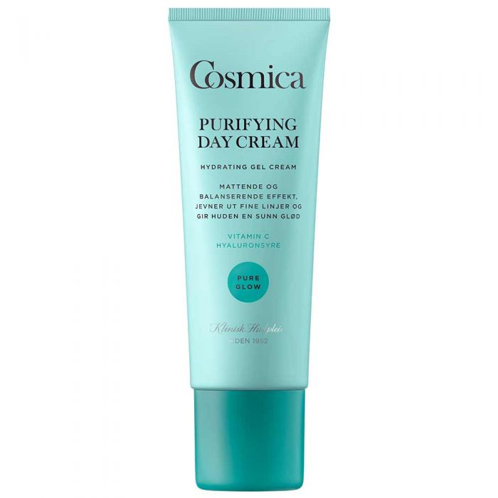 Cosmica Pure Glow Purifying Day Cream er en fresh gelkrem, spesielt tilpasset for voksen hud. Motvirker urenheter og de første aldringstegnene, samt har en mattende effekt. Gir en matt og ren hud med synlig reduserte linjer og naturlig glød. Intensivt fuktighetsgivende i opptil 24 timer. Tetter ikke porene. Inneholder blant annet vitamin C som beskytter huden mot frie radikaler, hyaluronsyre som binder fuktighet og forbedrer hudens elastisitet og sarcosin som reduserer fet hud og gjør huden matt. Mildt parfymert. Dermatologisk testet.