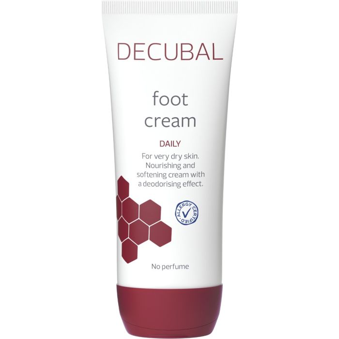 Decubal fotkrem til daglig pleie av svært tørr og sensitiv hud på føttene. Effektiv fotkrem til daglig bruk om gjør huden på føttene myk, forebygger sprekker og holder de freshe. I tillegg til karbamid (2 %) inneholder fotkremen blant annet mandelolje som pleier den tynne sarte huden på føttene, vitamin E som gir ekstra fukt og høyrenset lanolin og glycerin som mykgjør. Fotkremen har en beskyttende effekt mot uønsket lukt. Uten parfyme og fargestoffer. Fettinnhold: 37 %. pH: 4,5.