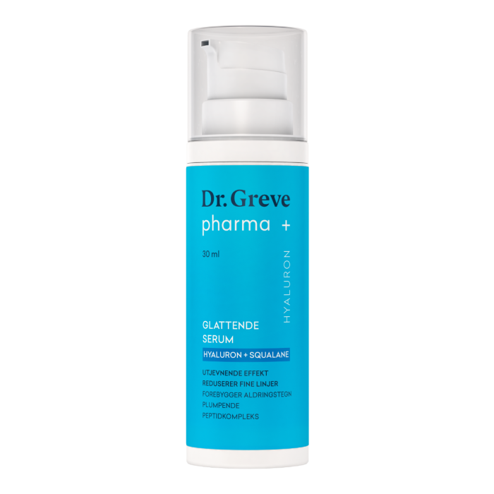 Dr. Greve pharma Glattende serum inneholder et peptidkompleks som sammen med power-duoen hyaluronsyre og squalane bidrar til en jevnere hud med mindre fine linjer. Dermatologisk testet på sensitiv hud.Dr. Greve pharma Glattende serum inneholder et peptidkompleks som sammen med power-duoen hyaluronsyre og squalane bidrar til en jevnere hud med mindre fine linjer. Serumet har en lett konsistens med hyaluronsyre i to molekylstørrelser for effekt både på hudoverflaten og dypere ned i huden. Sammensetningen av helteingrediensene er med på å forebygge aldringstegn. Serumet er mildt parfymert og dermatologisk testet på sensitiv hud.