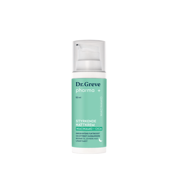 Dr. Greve Pharma Styrkende Nattkrem inneholder power duoen niacinamid og cica, som jobber aktivt sammen for å styrke hudbarrieren. Uten parfyme. Dermatologisk testet på sensitiv hud.