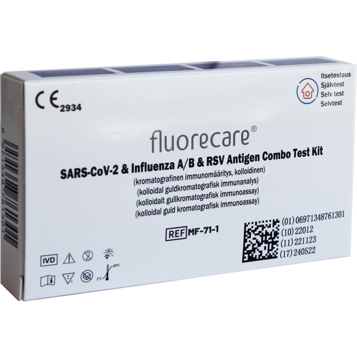 Fluorecare hurtigtest-selvtest for flere virusinfeksjoner i samme test, 1 prøve, 4 resultater. Testen har høy sensitivitet (>90%) for antigen fra SARS-CoV-2, Influensa A/B og RSV. Testen oppbevares i romtemperatur. Testen kan brukes av både voksne og barn over 2 år. Kan brukes uten veiledning fra helsepersonell. Les pakningsvedlegget nøye før bruk. Medisinsk utstyr- In Vitro.