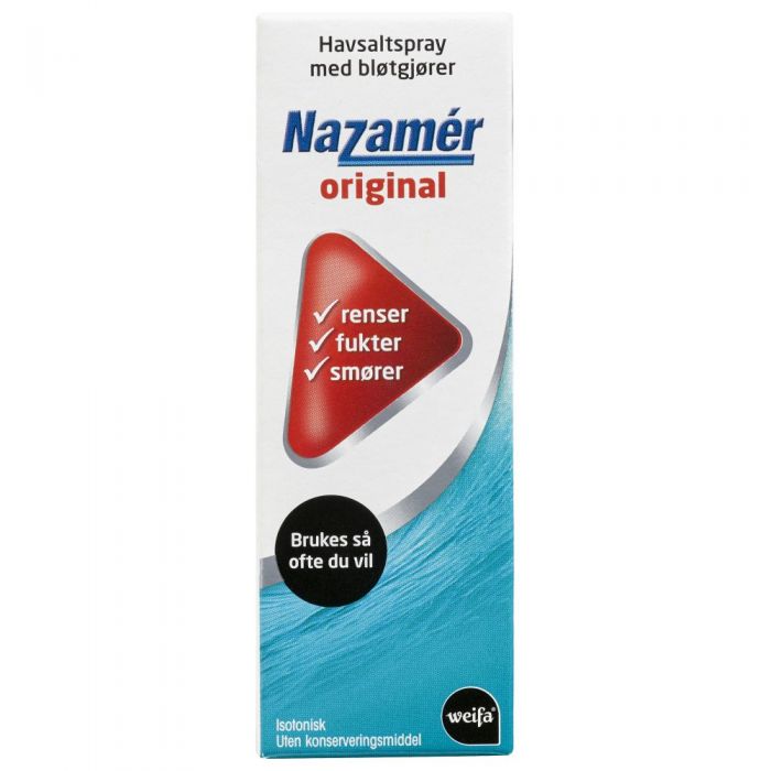 Nazamér original Nesespray renser, fukter og smører nesen ved forkjølelse eller annen form for iritasjon i nesen. Nazamér original løser opp slim og renser nesen for sekret, støv og pollenkorn. Nazamér original fukter tørre og såre slimhinner og motvirker tørr nese forårsaket av miljøet rundt oss (forurensning, støv og tørr luft). Havsalt renser ved tett nese, f.eks. ved forkjølelse eller pollenallergi. Dekspantenol (en form av vitamin B5) motvirker også skorpedannelse forårsaket av slim i nesen.