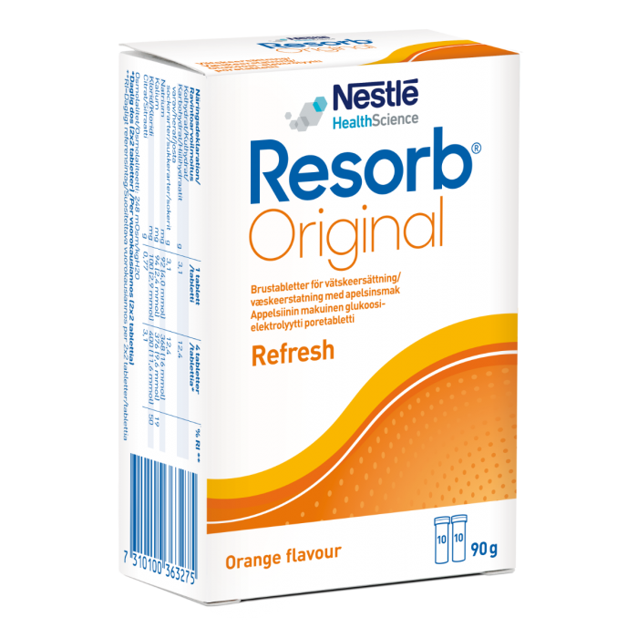 Resorb Original, er en væskeerstatning med karbohydrater og elektrolytter som brukes for å tilføre væske og salter. Brusetabletter, finnes i smakene appelsin og bringebær.