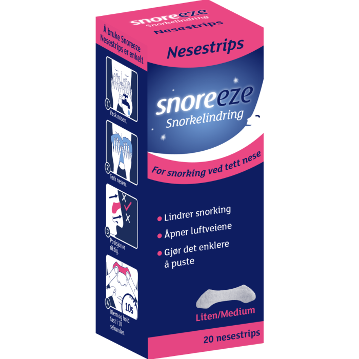 Kun til utvortses bruk. Oppbevares utilgjengelig for små barn. Ikke bruk på sår, solbrent, irritert eller skadet hud. Hvis hudirritasjon oppstår, må du slutte å bruke den umiddelbart. Ikke bruk den mer enn 12 timer per dag. Oppbevares på et tørt sted. Snoreeze Nesestrips er ikke beregnet for å behandle søvnapné. Vennligst kontakt legen din hvis du mistenker at du lider av denne tilstanden.