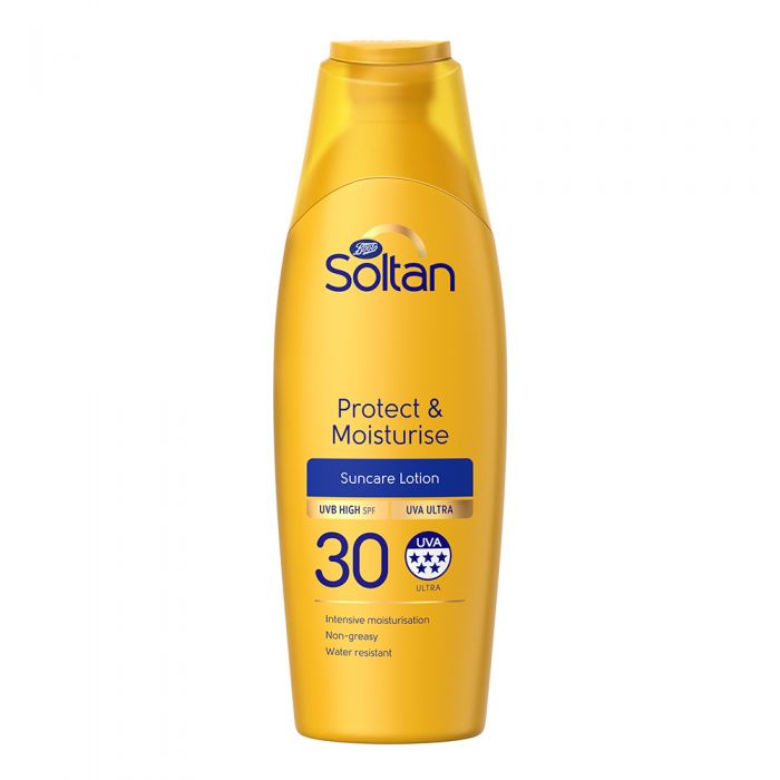 Soltan Protect & Moisturise Lotion med SPF 30 er en lett absorberende sollotion og gir langvarig fuktighet.