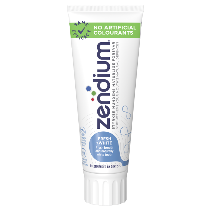 Zendium Fresh+White inneholder zink som nøytraliserer stoffene som gir dårlig ånde, og et optimalisert nivå av slipemiddelet Silica for skånsom fjerning av misfarginger. Med en ekstra frisk mintsmak. Inneholder fluor som forebygger hull og forsterker emaljen, samt enzymer og proteiner som forsterker munnens eget forsvar.